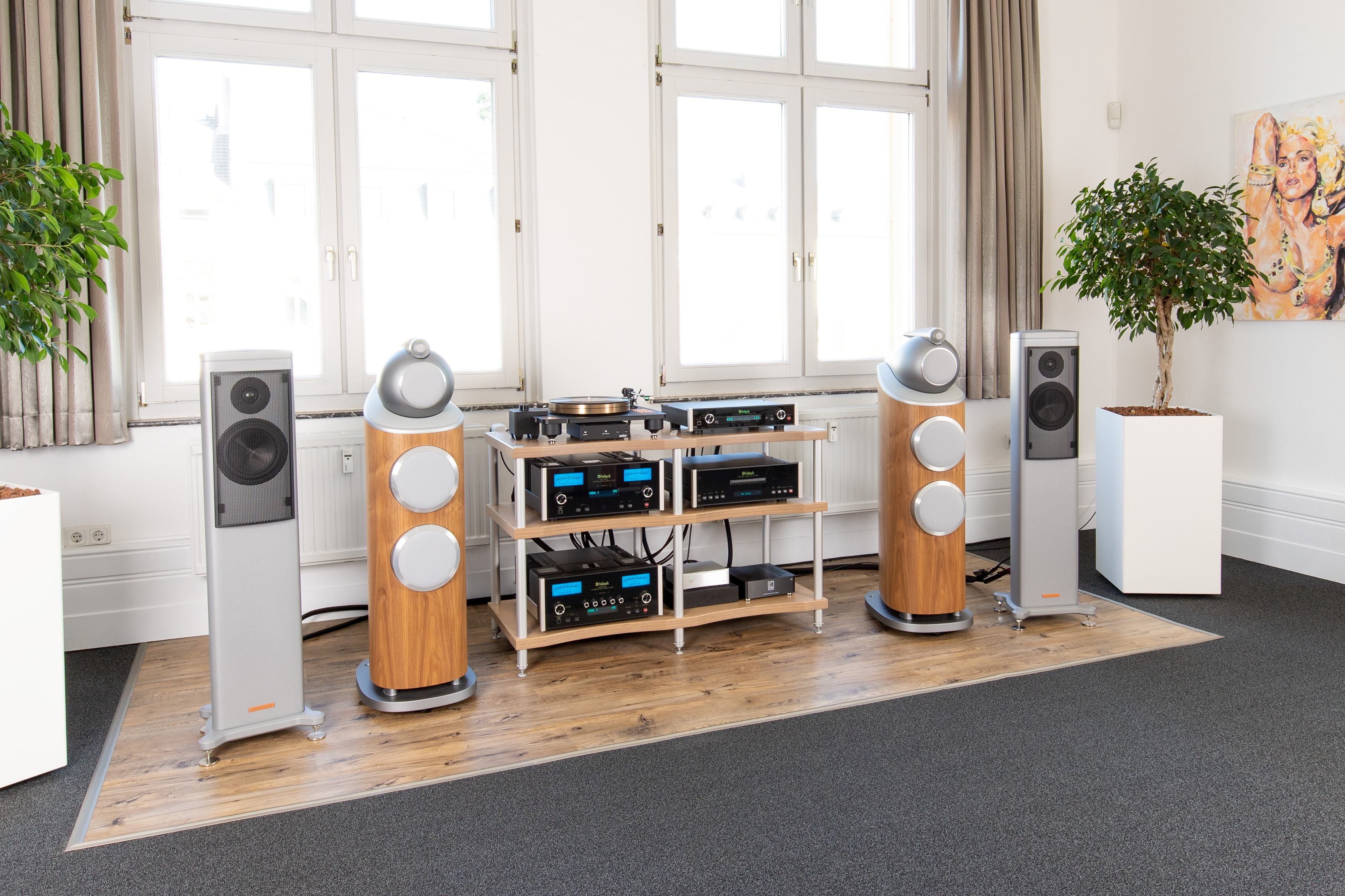 In diesem Hörraum spielen wir verschiedene Lautsprecher von Magico, der Sonus faber Olympia Nova Serie und der Bowers & Wilkins 800er Serie. Bei der Verstärker Elektronik können verschiedene Vollverstärker von McIntosh probegehört werden, so wie der Röhrenvollverstärker von Audio Research.